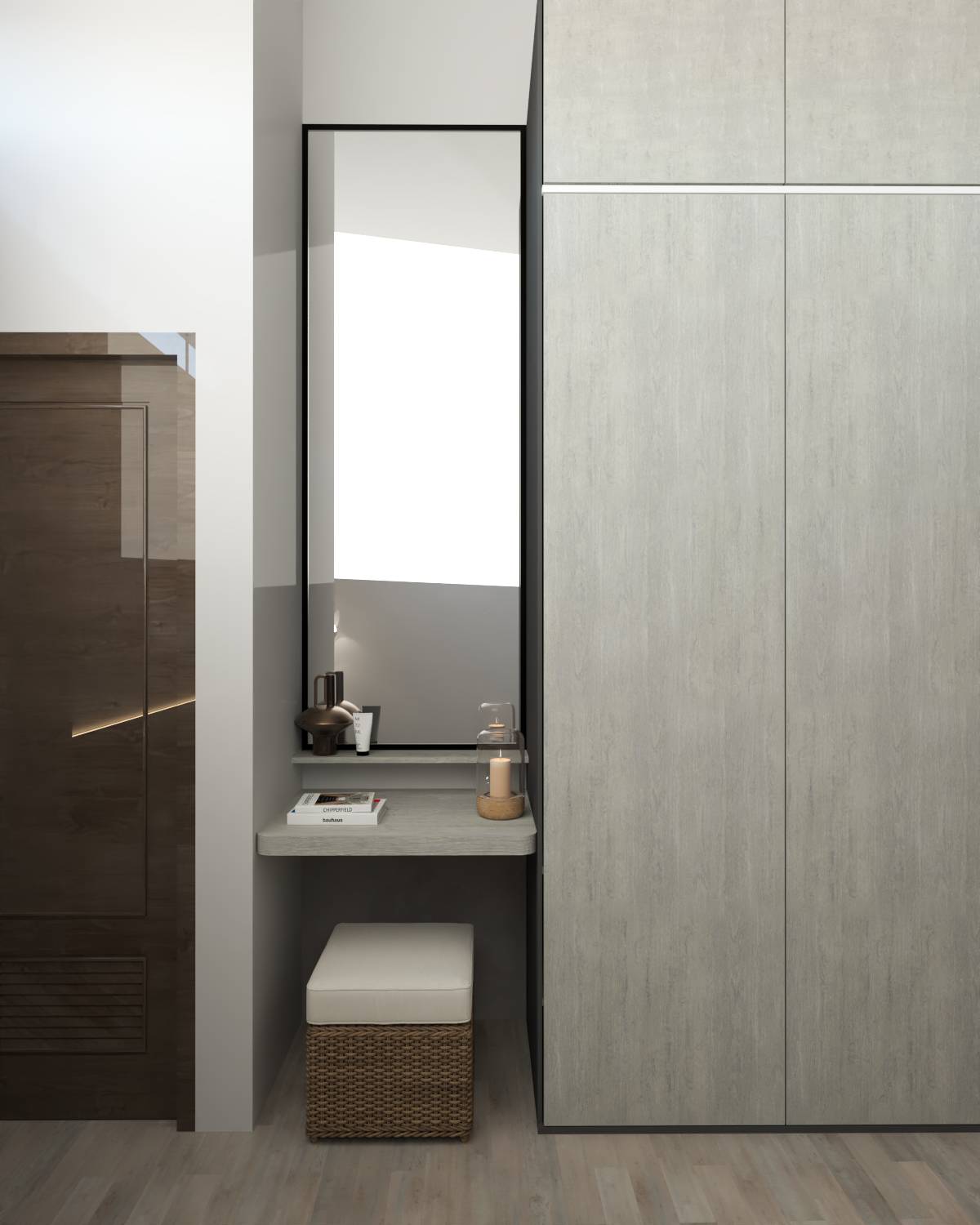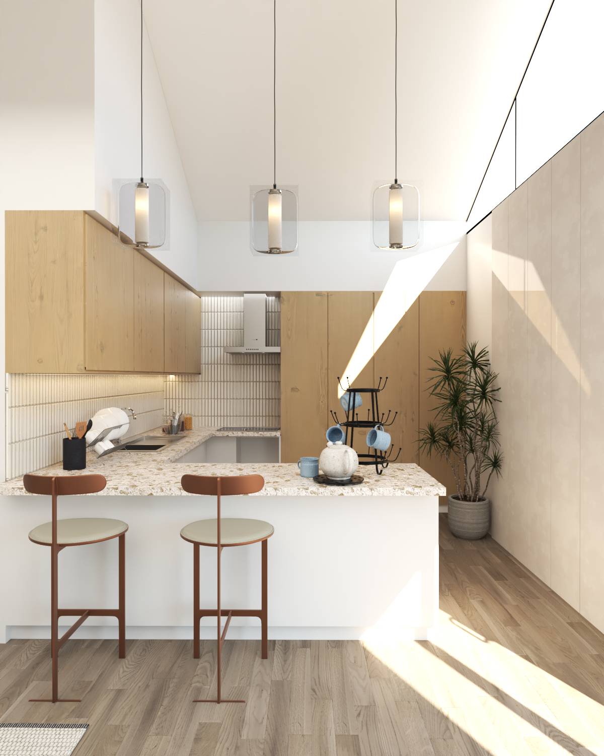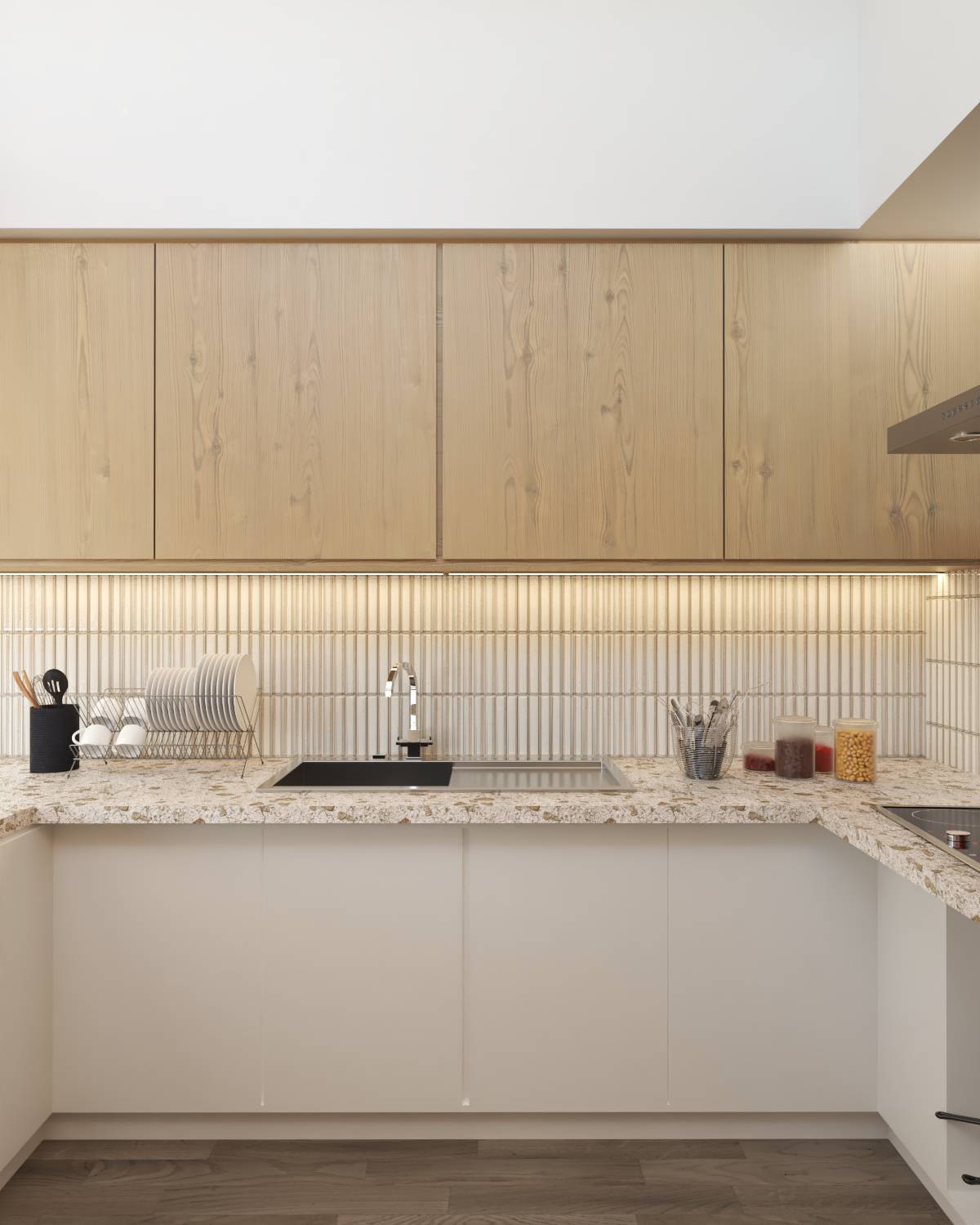 A palette of light oak, warm beige, and soft neutral tones establishes a soothing rhythm throughout the space. Subtle textures and natural materials create warmth and visual harmony, ensuring the interior feels both tranquil and sophisticated. The result is an environment that enhances everyday living while maintaining a quiet, timeless character.